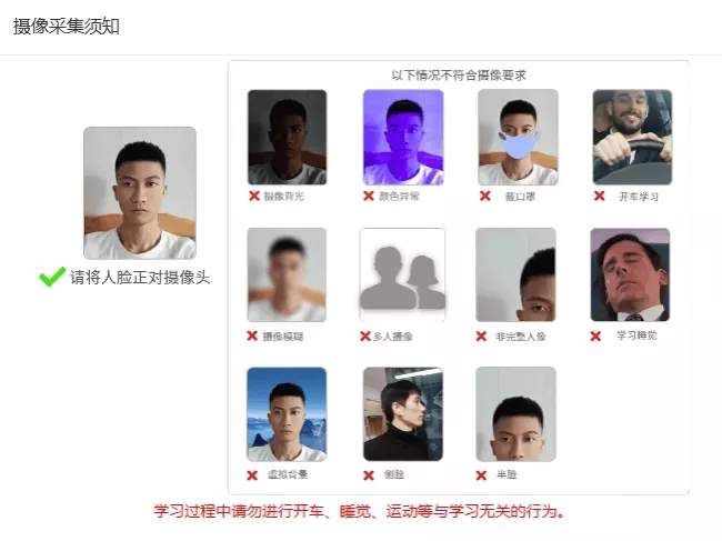 4、 学员务必按要求完成学习,不得替学、快进、调速、挂播等操作,保证上课时摄像头是开启状态,学习过程中会随时对学员进行抓拍,学员需注意学习环境,不要影 响摄像头对人脸的识别,保证摄像头拍摄到人脸完整性,具体的摄像采集要求详见下图。一旦发现非本人学习、学习过程中无抓拍照片,或出现挂播、拖动等造成照 片连拍的,一律视为无效学时退回重学。